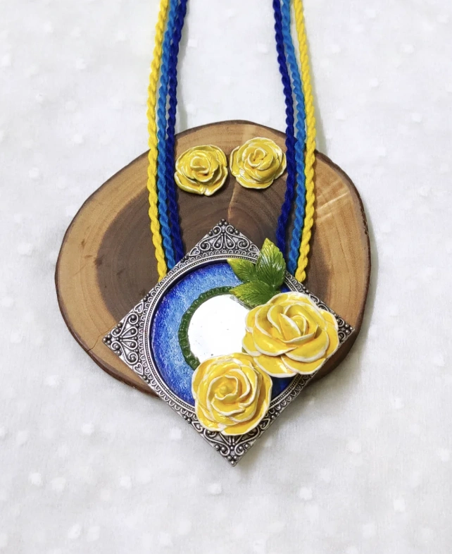 The contrast between the silver filigree frame and the bright yellow clay roses is just chef’s kiss. Also, but wait, peep the hand-painted blue ombré background – so dreamy! the pendant feels substantial without being heavy, plus the braided blue and yellow cord is adjustable, which is always a win. This Clay Charm Necklace feels like a unique piece of wearable art.