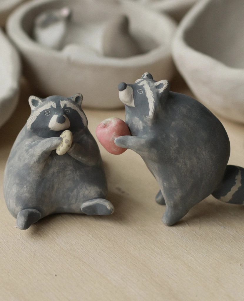Two Gray Clay Raccoons with Apple and Cookie
