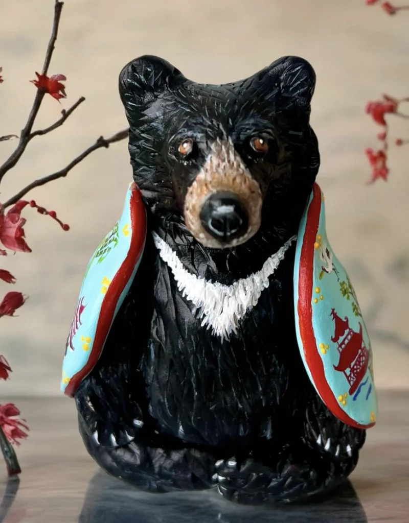 Handcrafted Black Bear Figurine with Decorative Painted Shawl