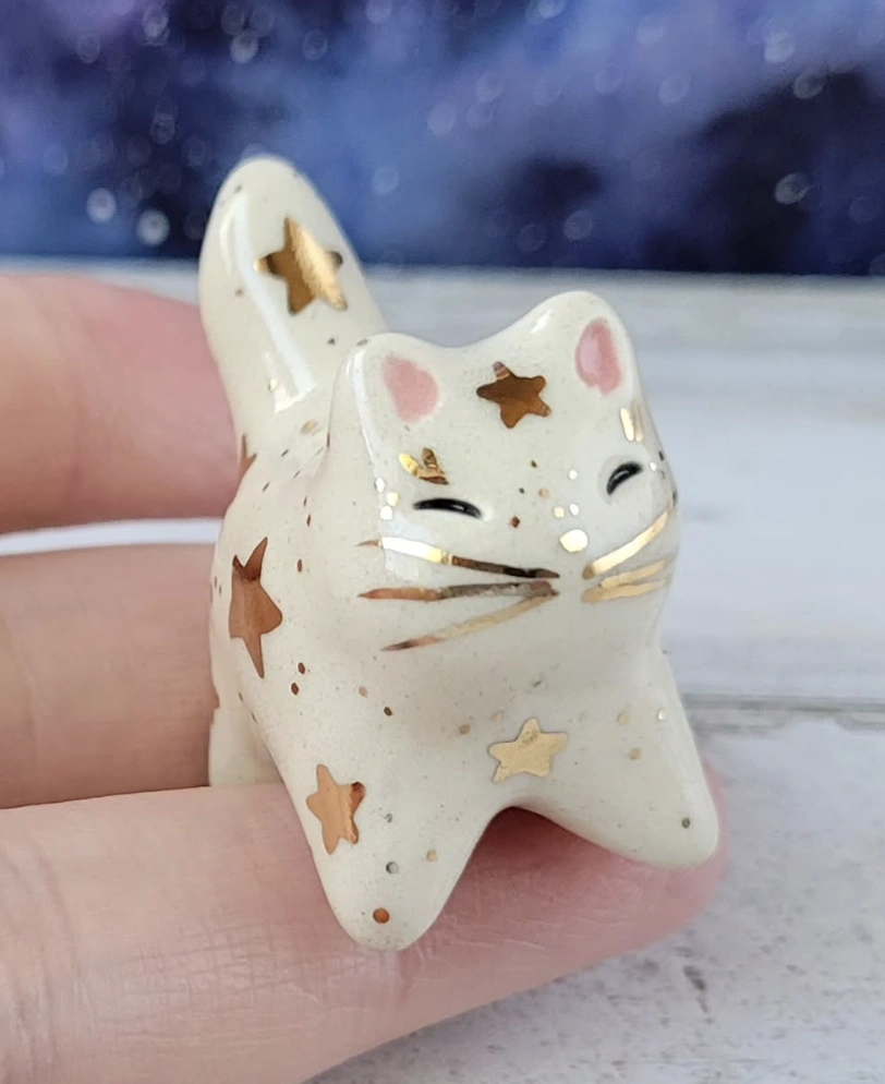Creamy White Kitty with Gold Star Accents – Mini Clay Art