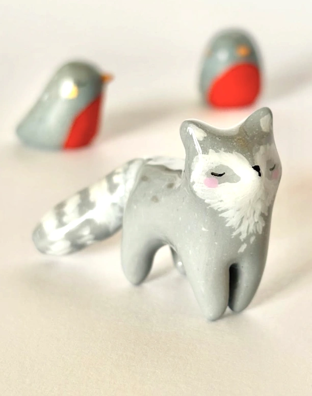 Handmade Grey Clay Fox Figurine with Robin Accents