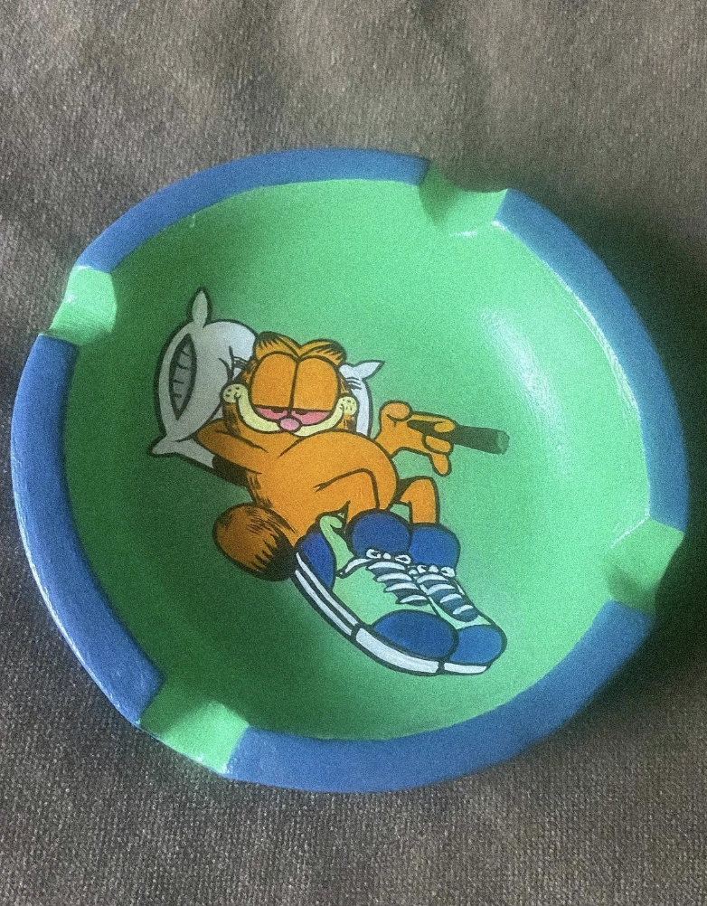 You HAVE to see this ashtray. Okay, so you know how sometimes ashtrays are, like, super ugly and clash with everything? This solves it. It’s got Garfield chillin’ with sneakers, haha. I’ve actually been brainstorming some rad “Clay Ashtray Ideas” lately, but this one blows them all away. Plus, the bright green and blue? So cute and unexpected.