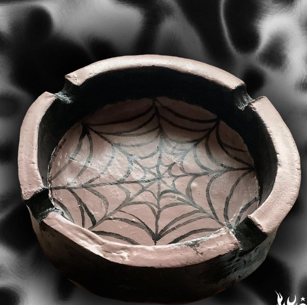 Hand-Painted Clay Ashtray with Spiderweb Design