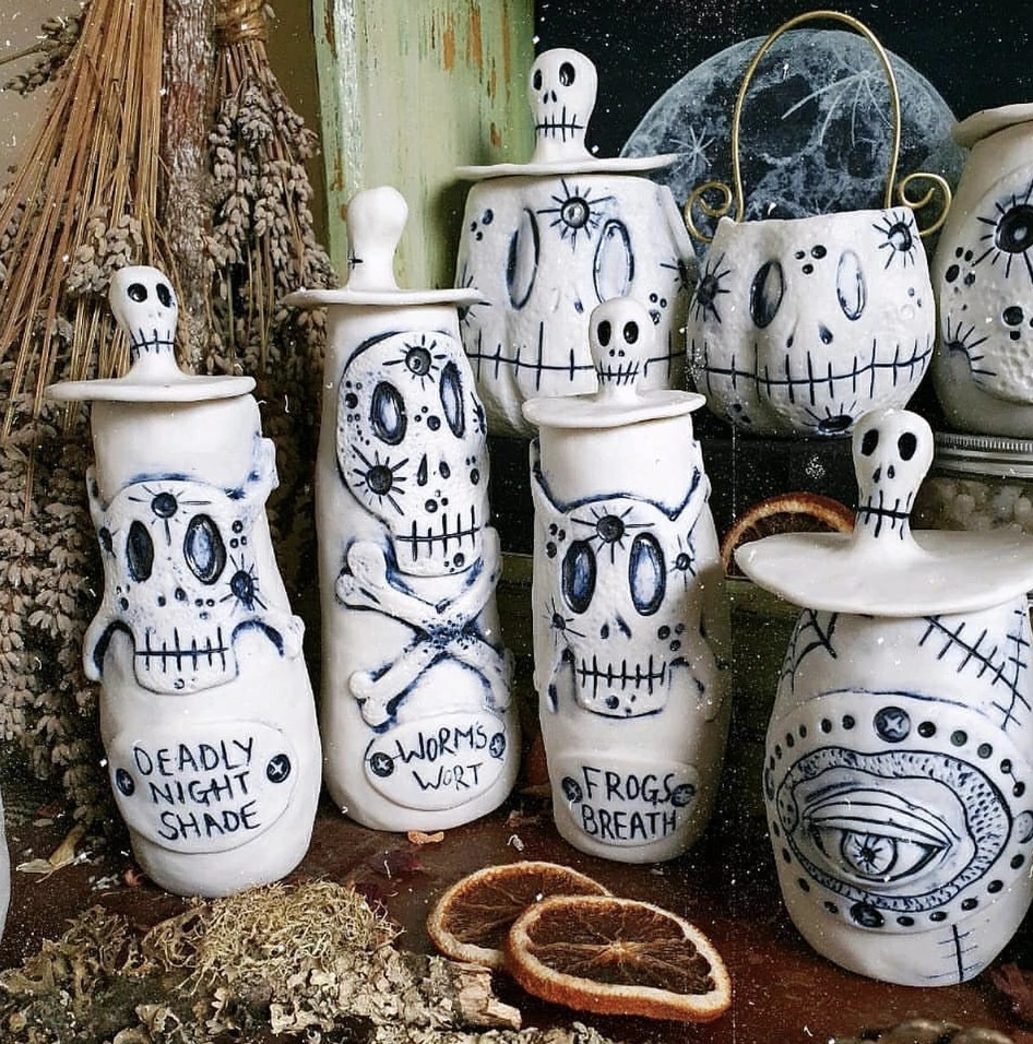 I appreciate the tactile nature of this craft. Also, notice the playful skull toppers of each jar – an unexpected contrast to the darker themes. The hand-drawn, slightly imperfect lines defining the skulls and eyes add character. I think it reflects the -Pottery Aesthetic- of celebrating human touch. Dried orange slices casually scattered around complete this intriguing display.