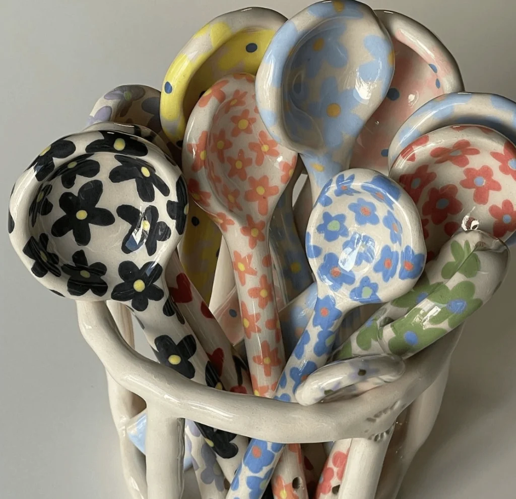 There’s a certain charm in handmade imperfection, and these beginner pottery spoons capture it perfectly. But here’s the thing, notice the slightly wobbly edges of the spoons – evidence of the maker’s hand. The basket itself, a simple lattice of ceramic, elevates what would otherwise be a mundane display. Each spoonful is a miniature canvas, bursting with naive, cheerful blossoms.