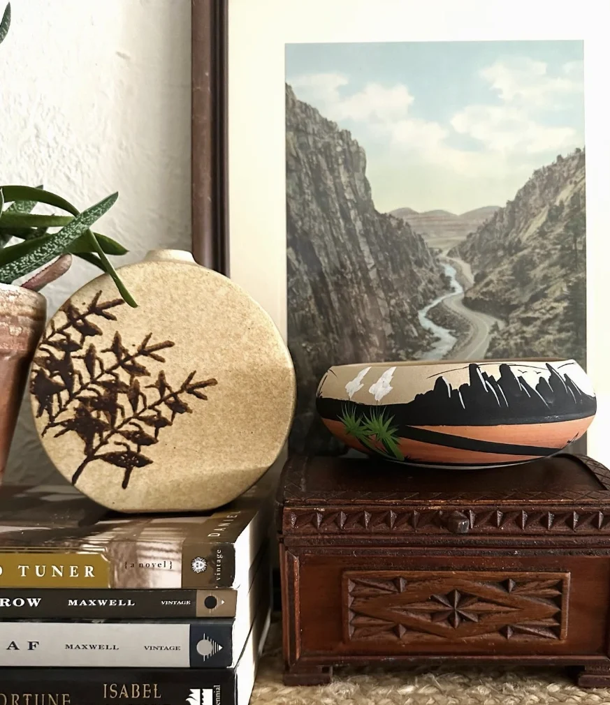 Okay, I’m really digging the glazing on these vases; the almost watercolor effect gives it that homemade vibe, which is cool. The owl is adorable, and perched on top of those books? It’s just quirky enough. This would be an awesome setup if you’re just getting into Beginner Pottery and want some inspo to go for.