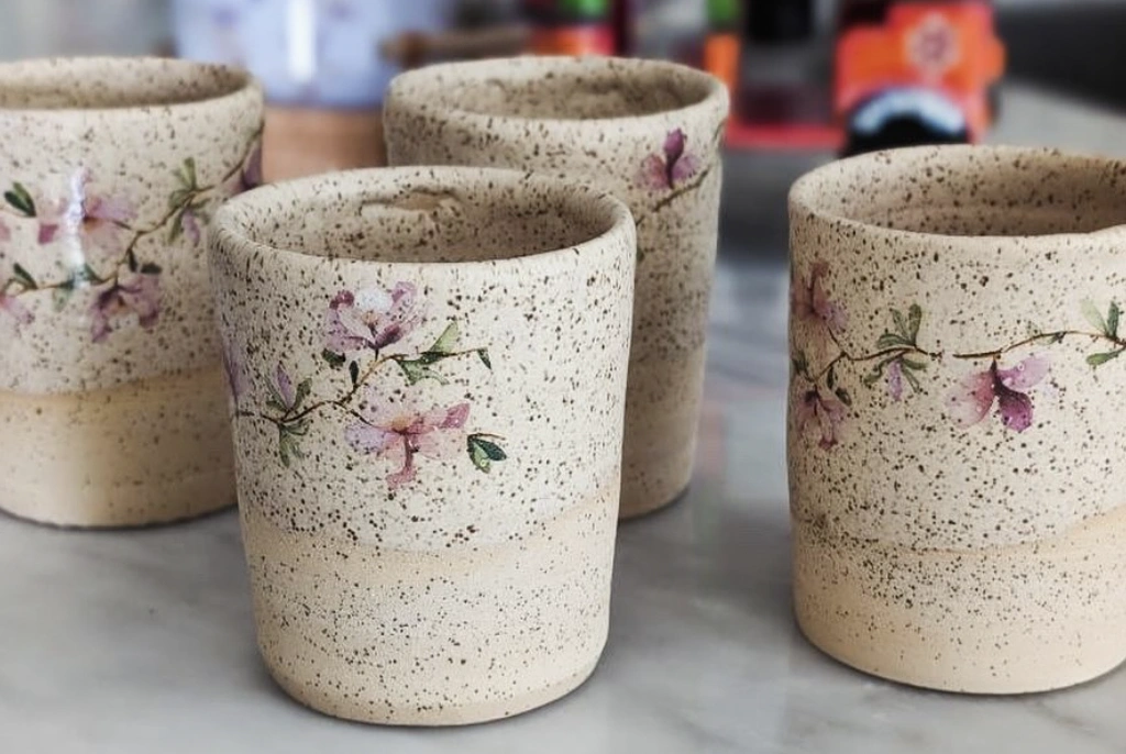 Speckled Beige Pottery Mugs with Floral Detail