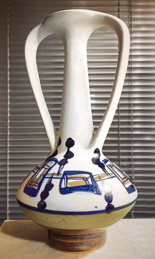 Forget those perfectly symmetrical vases you see everywhere. Also, this is different. The elongated neck and bold handles are architectural, almost brutalist. The geometric patterns? That’s where it gets fun. It’s obviously hand painted pottery, but elevated, the marks deliberately imperfect. It’s got soul, it’s got depth, and it’s definitely got a story. Display this on a shelf and watch it become the conversation starter.
