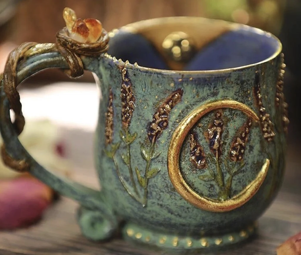 The textured teal glaze is so dreamy, and the gold crescent moon accent just pops. Also, obsessed with the little birds nest with the amber stone on the handle, it’s seriously the cutest detail ever. I can’t believe how intricate the floral details are, you can tell a lot of love went into making these Ceramic Crafts!