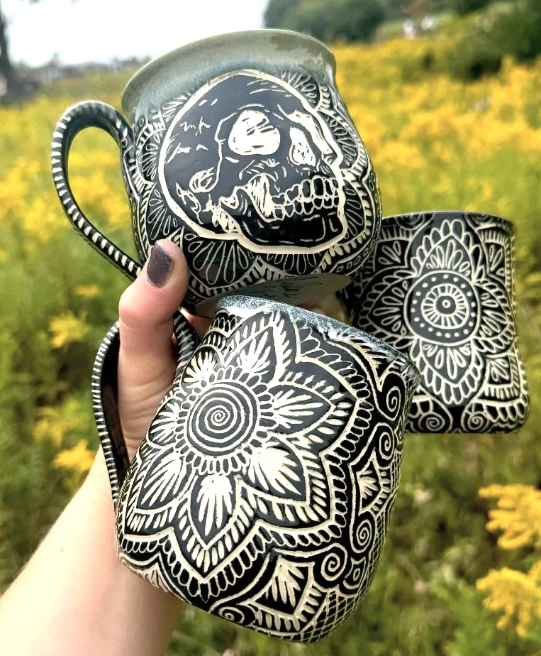 Forget those boring plain mugs, these are on another level! the carved designs are so intricate. I love that one has a skull, while the others are all about the floral thing. So obsessed with the Pottery Aesthetic happening here. Seriously, like who wouldn’t want to drink their morning coffee out of one of these? They look and feel super special!