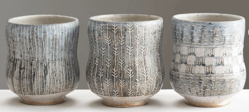 Stacked Handcrafted Ceramic Mugs with Earthy Designs