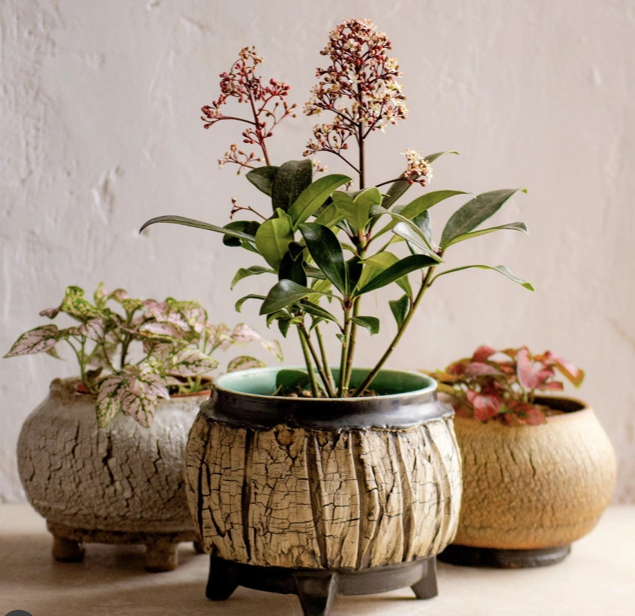 Trio of Textured Pottery Planters with Botanical Accents