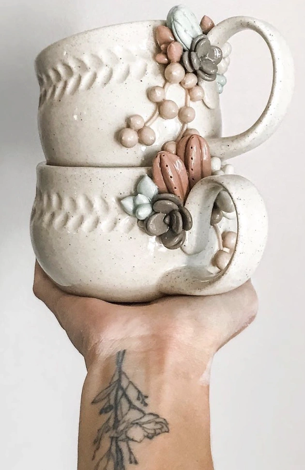 Stacked Ceramic Mugs with Sculpted Succulent Details