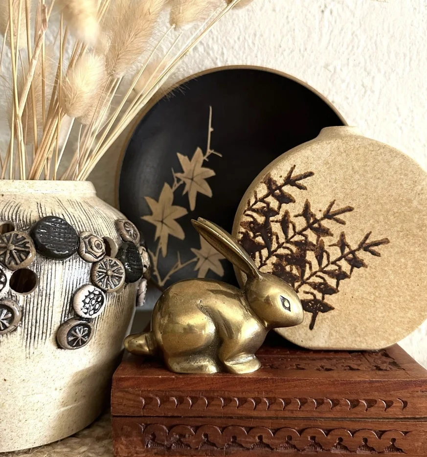 I’m really loving the trend of incorporating natural textures into home decor, and this display nails it. Also, the muted tones and variety of materials create a cozy, collected feel. What I especially like is the contrast of shapes, plus the brass bunny adds a touch of vintage charm. The vases are very nice as well – they appear to be Handmade Ceramics, giving the setup an artisanal touch that’s both on-trend and timeless.